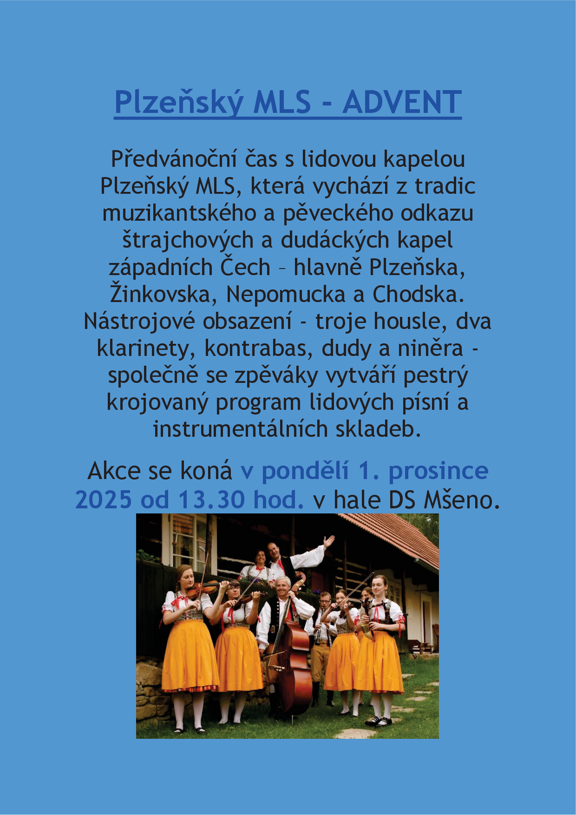 Zveme vás na posezení s lidovou kapelou Plzeňský MLS. Akce se koná v pondělí 1. prosince 2025 od 13.30 hod. v hale DS Mšeno.