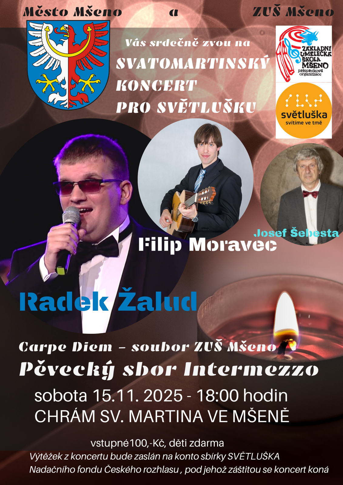 Srdečně vás zveme na svatomartinský koncert pro Světlušku, který se koná v sobotu 15.11.2025 od 18:00 v kostele sv. Martina. Přijďte si poslechnout krásné písně a podpořit dobrou věc.