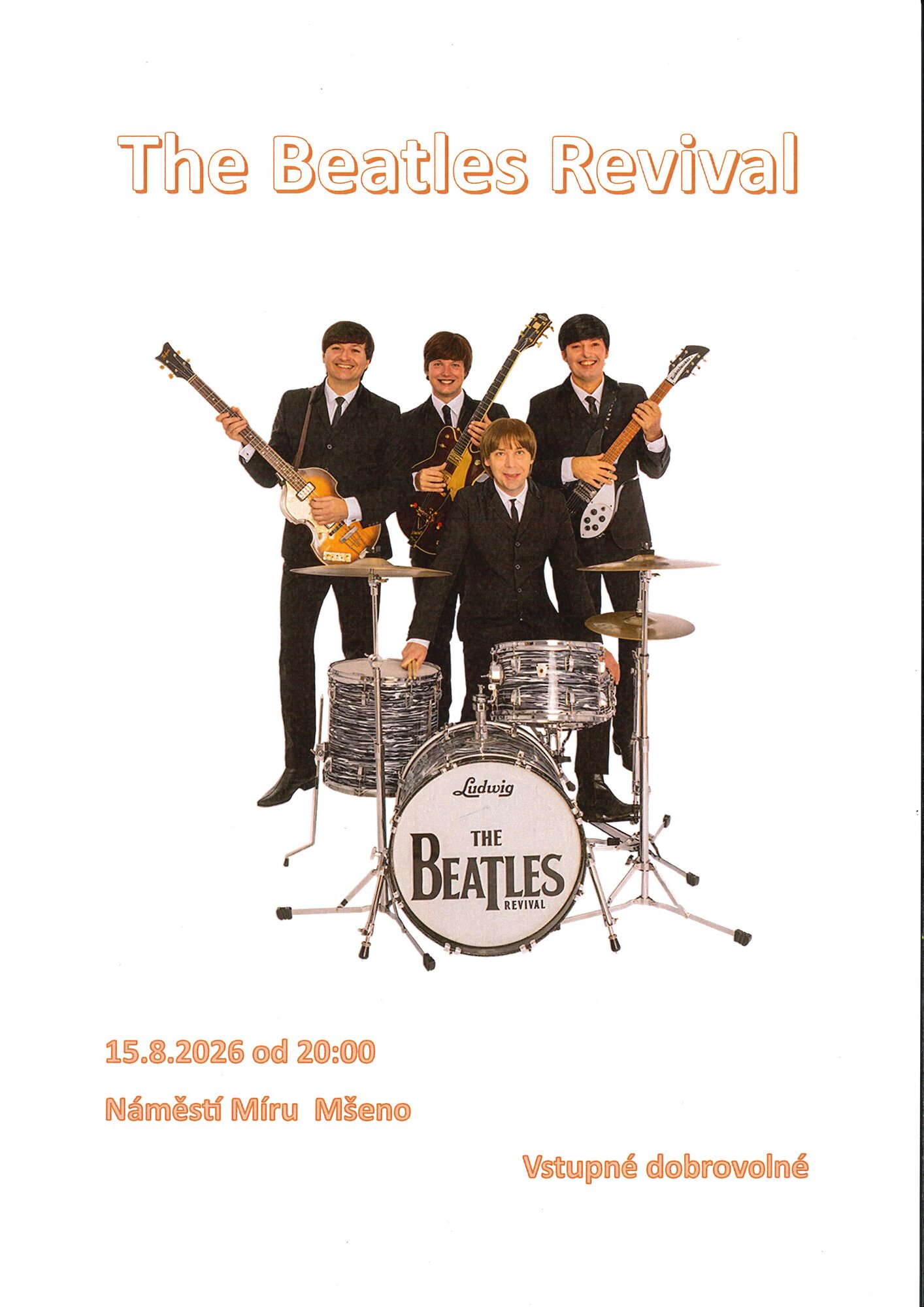 Město Mšeno Vás srdečně zve na koncert kapely The Beatles Revival Kladno. Vystoupení se koná 15.8.2026 od 20.00 na náměstí Míru ve Mšeně. Vstupné na akci je dobrovolné. Přijďte v hojném počtu a dobré náladě, těšíme se na Vás.
