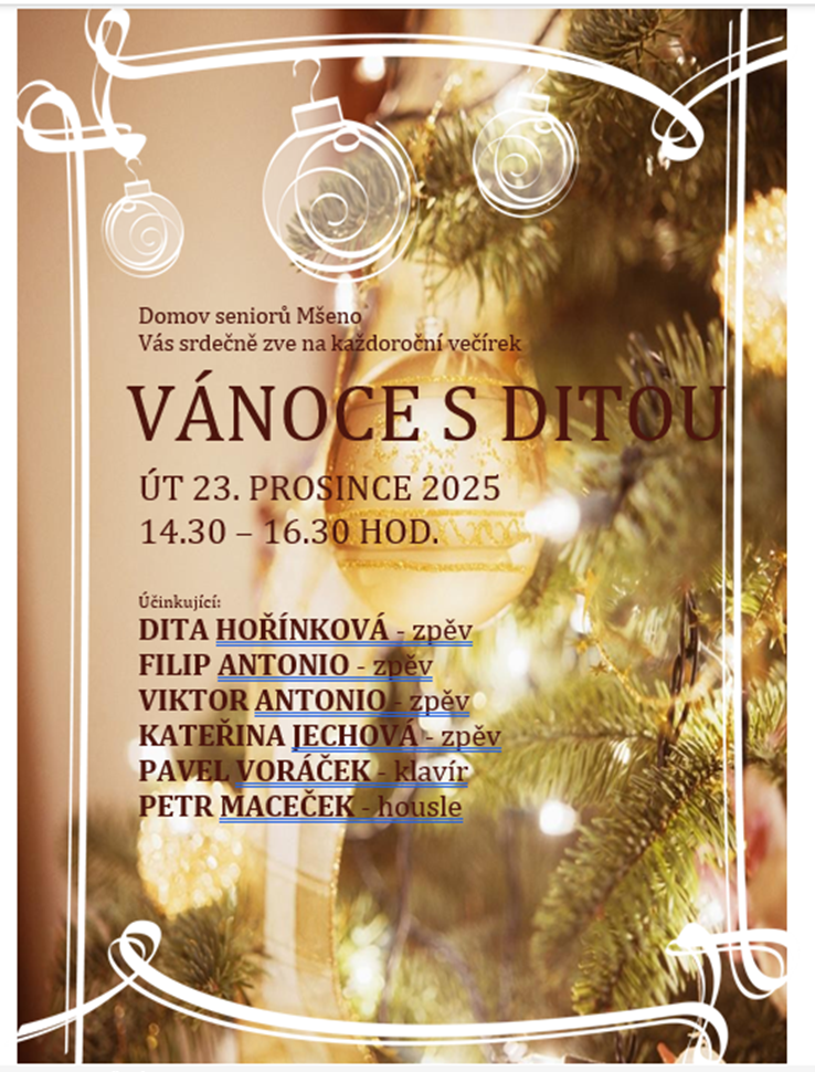 Domov seniorů Mšeno vás zve v úterý 23.12.2025 od 14:30 na tradiční vánoční večírek s Ditou Hořínkovou a jejími hosty.